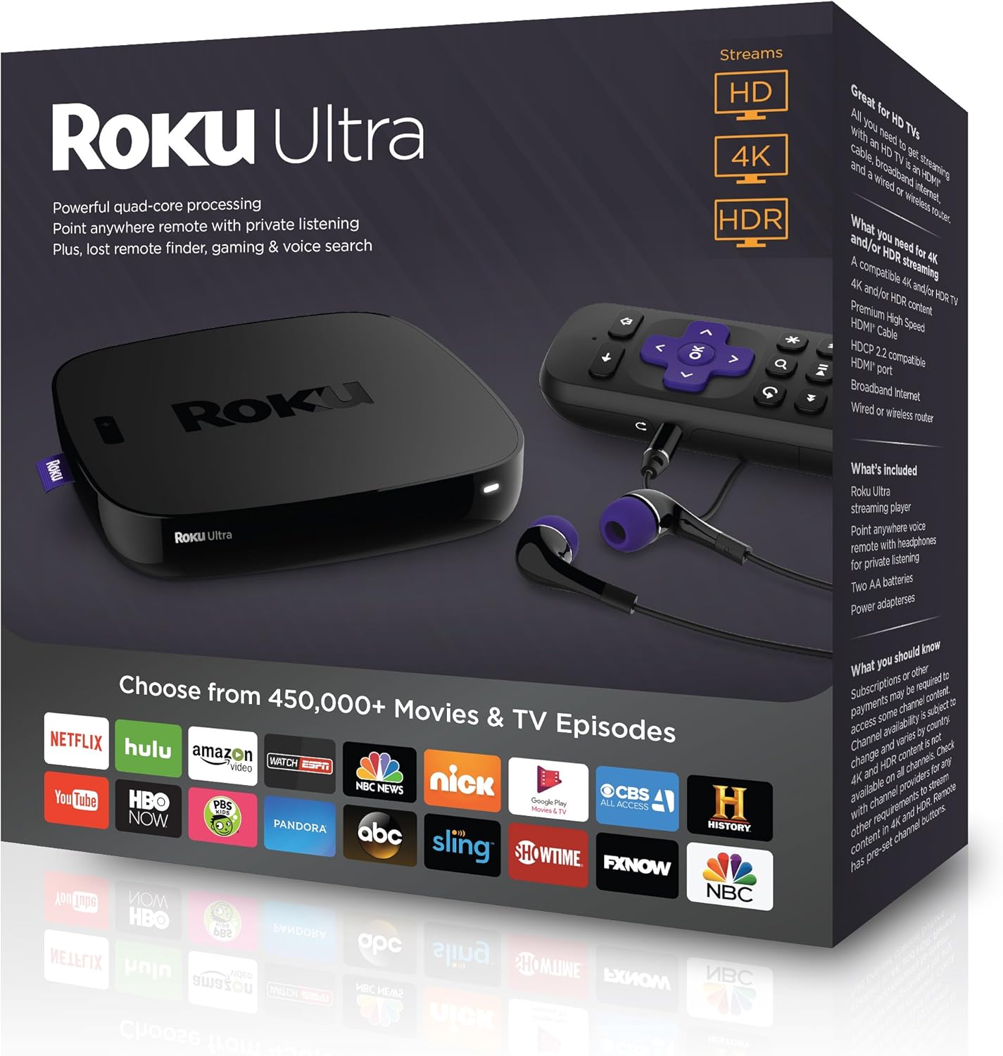 Roku Ultra LT 4KHDRHD Streaming Player with Enhanced Voice Remote Ethernet W Premium 6FT 4K Ready HDMI Cable 64GB MicroSD for Faster Channel Loading US Version 8499 Sold shipped by Cellmigo. The Roku Ultra is a rounded square 49 inches across all black plastic with a little purple tag. On the top theres a remote.